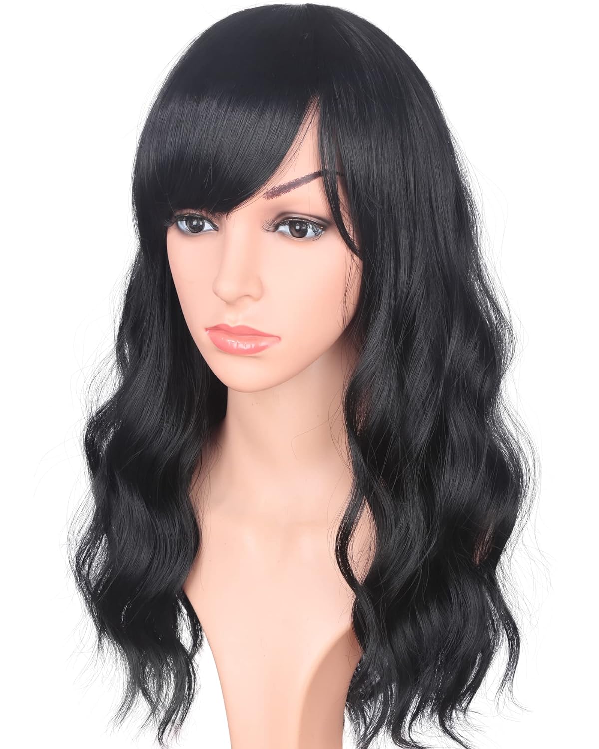 Medium Long Black Wavy Wigs For Women Synthetic Full Hair Natural Black Wigs With Side Bangs For Daily Use 16 Inches (NATURAL BLACK(1#))